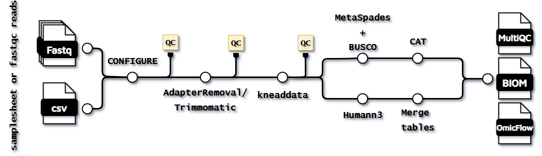The metagenomics microbiomics pipeline is a best-practice suite for the decontamination and annotation of sequencing data obtained via short-read shotgun sequencing. The pipeline contains NF-core modules and other local modules that are in the similar format. It can be runned via both docker and singularity containers.