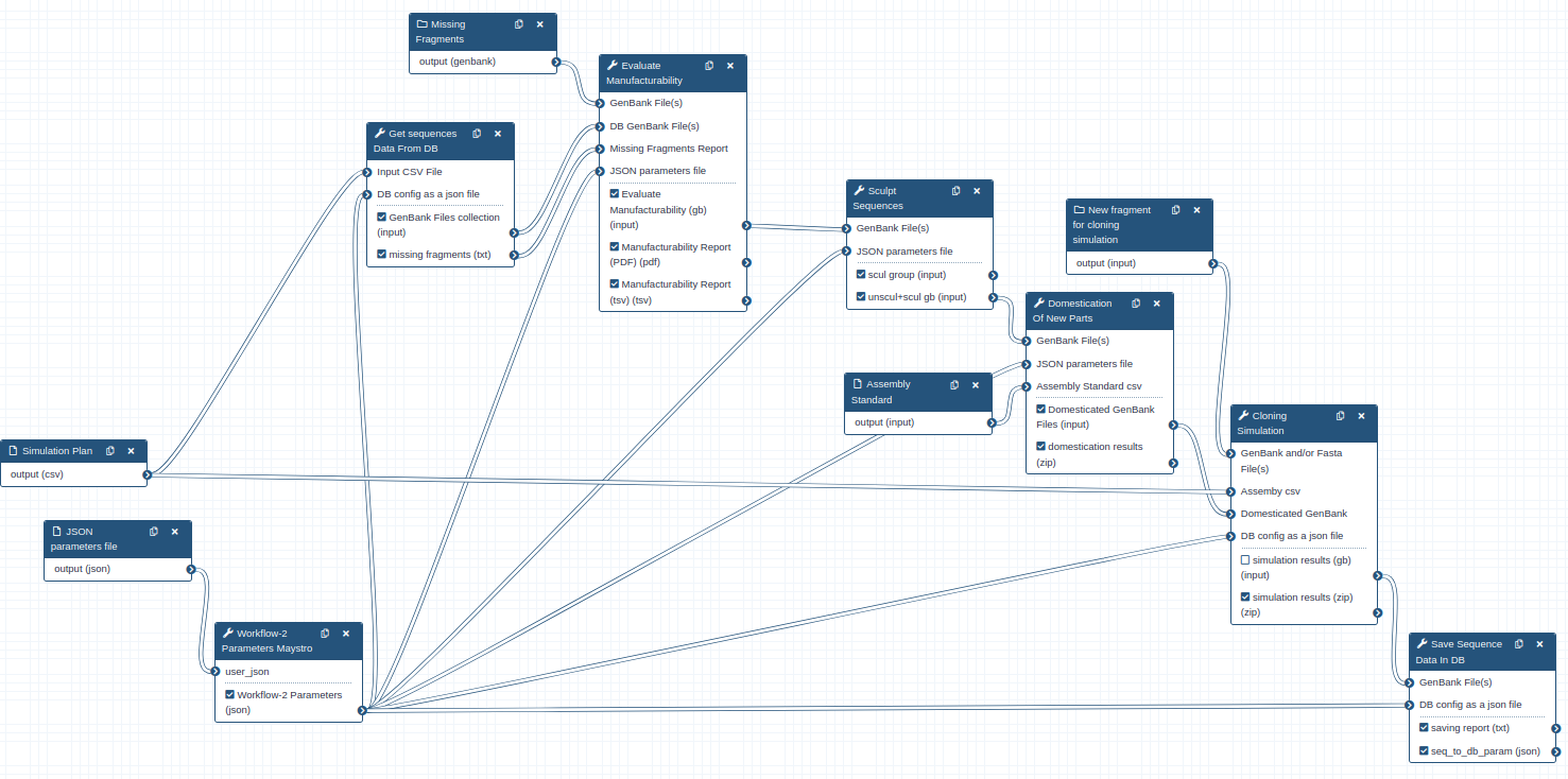 - JSON parameters file (optional) : The JSON file should contain the the parameters used in workflow tools. If this input is not set, user should set the parameters mannualy in the maystro tool.