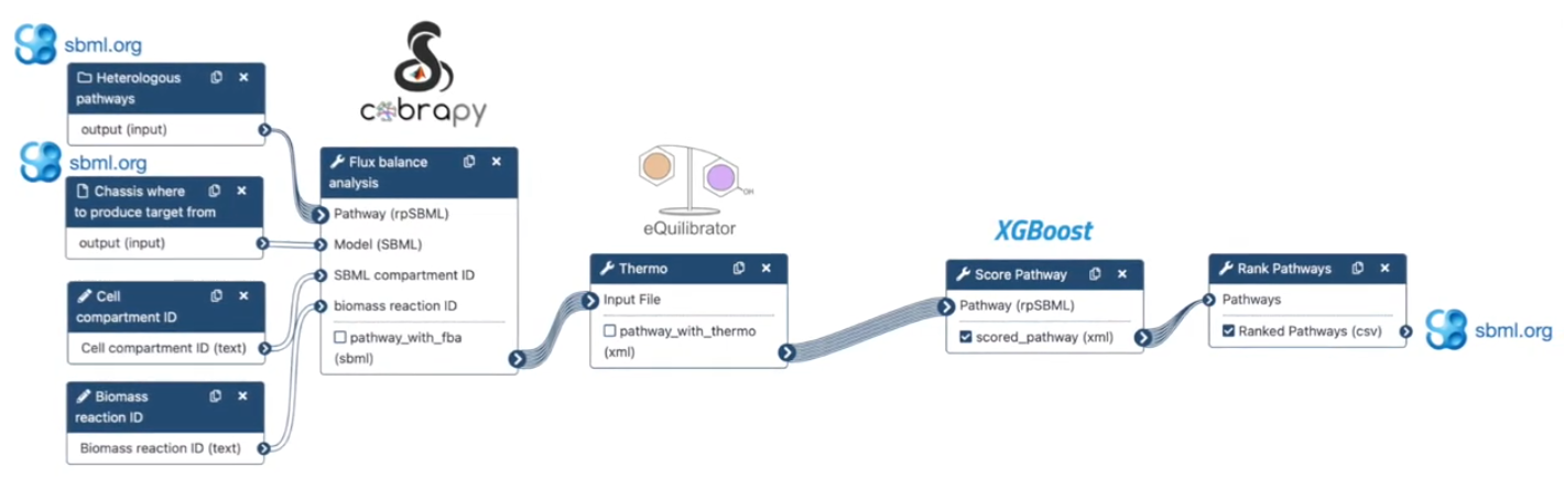 Annotation: Evaluating and ranking a set of pathways based on multiple metrics. Given a set of pathways generated by RetroPath2.0, this workflow informs the user as to the theoretically best performing ones based on the four criteria (target product flux, thermodynamic feasibility, pathway length, and enzyme availability).
