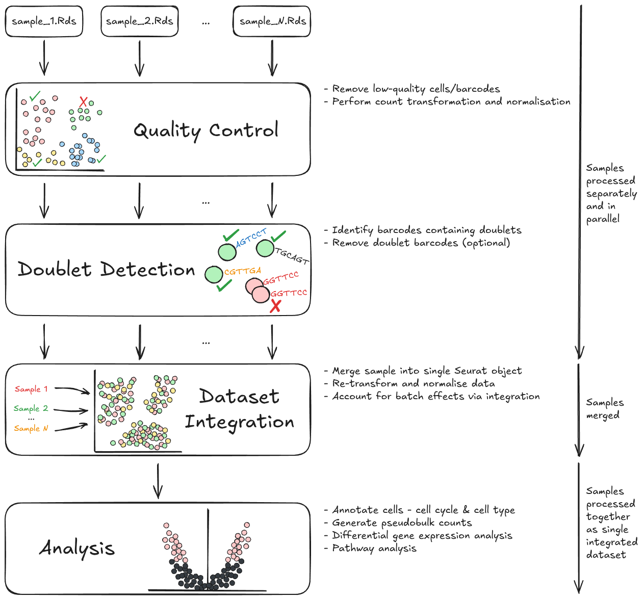 The workflow presented in these notebooks is the synthesis of best practices, studies, and discussions of how to analyse scRNA data with a focus on using Seurat in R. Footnotes and external links accompany the text throughout the document - please view these for useful additional information and rationale on why steps are done in certain ways.