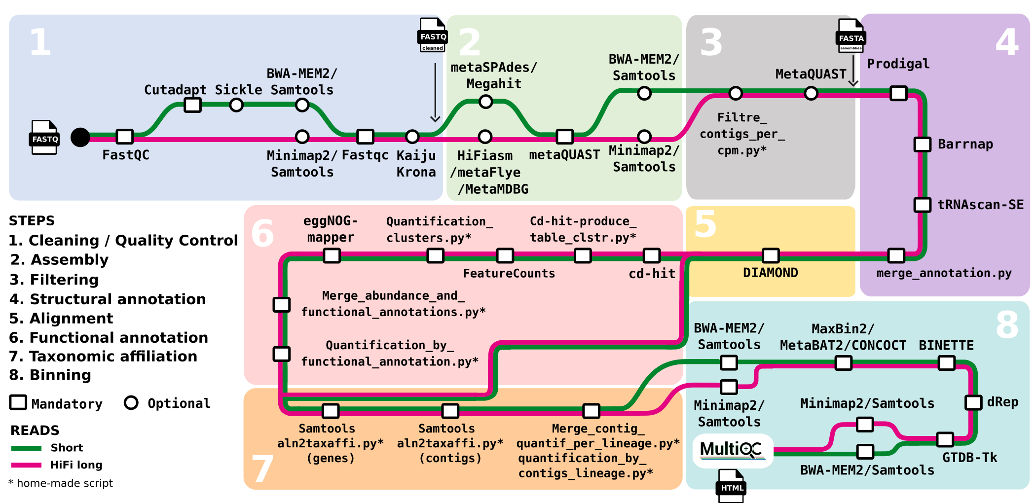 metagWGS is a Nextflow bioinformatics analyses pipeline used for metagenomic Whole Genome Shotgun sequencing data (illumina HiSeq3000 or NovaSeq, paired, 2*150bp ; Pacbio HiFi reads, single-end). It allows assembly, taxonomic annotation, and functional annotation of predicted genes.