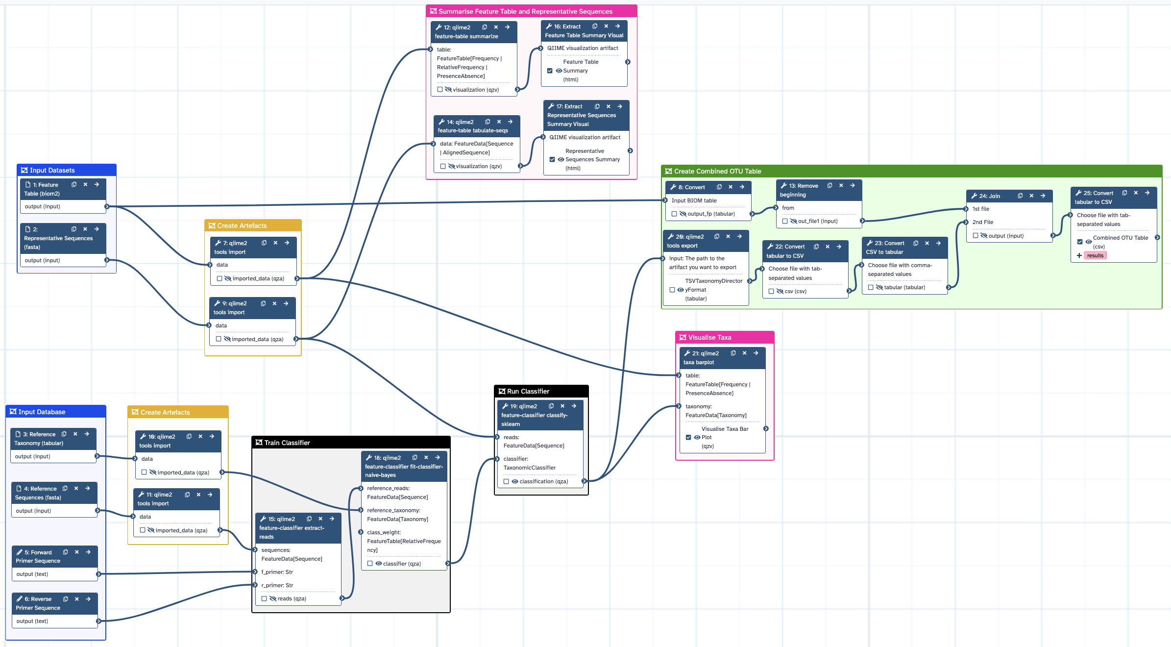 This workflow performs taxonomic assignment for an input OTU/ASV (Operating Taxonomic Unit/Amplicon Sequence Variant) Feature Table and set of amplicon Representative Sequences using QIIME2. The workflow creates and trains a QIIME2 classifier for an input reference taxonomic database (e.g. HOMD, SILVA, PR2, UNITE) and uses the trained classifier to assign taxonomy to OTUs/ASVs in the input Feature Table.